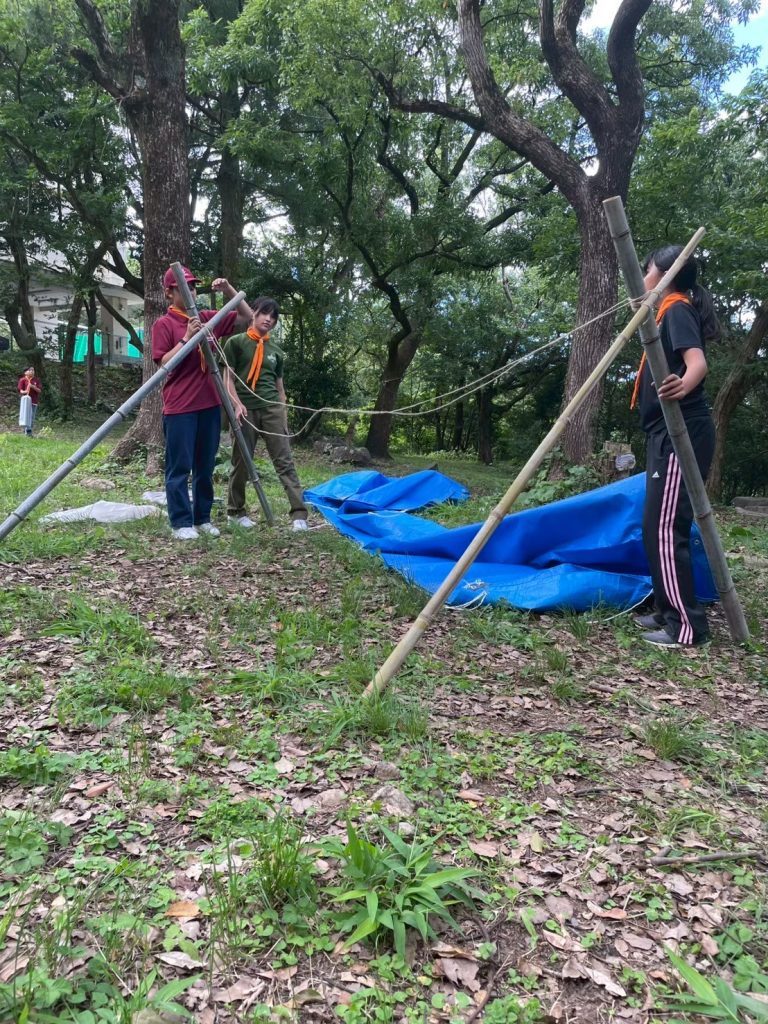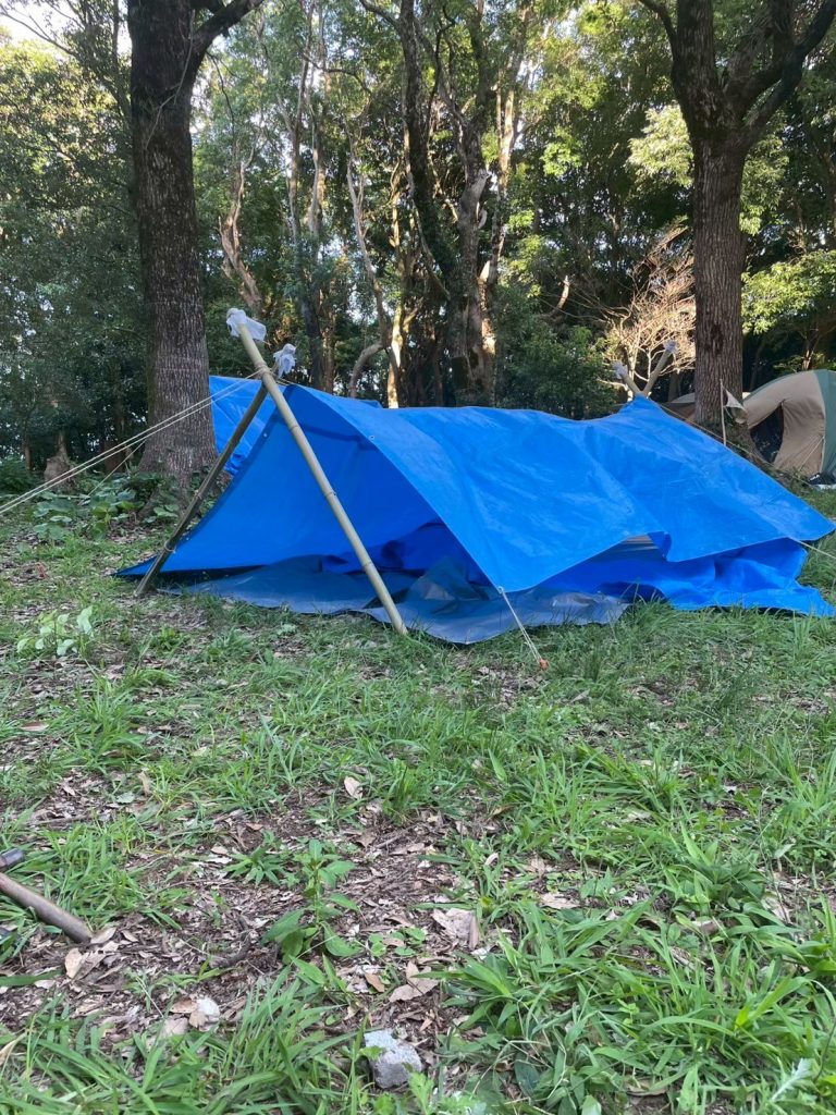 事前の班集会で考えていたテントの構造をチームワークでテキパキと?組み上げました。