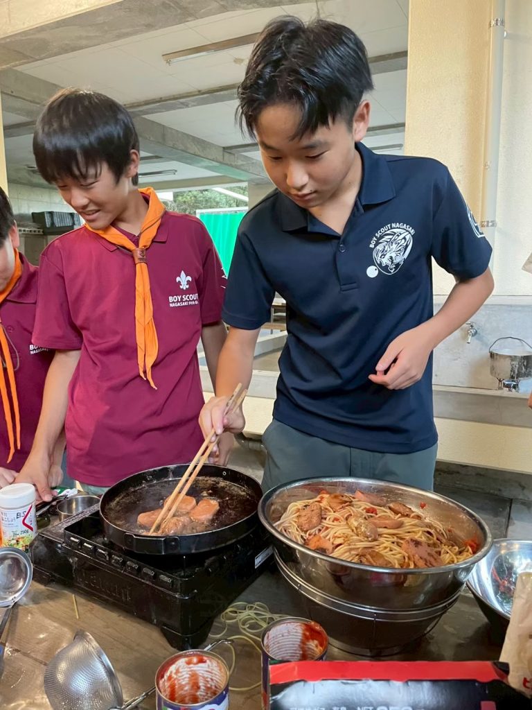 そして自分たちで考えた防災メニューつくり。油がないというハプニングをマヨネーズで代用し、事なきを得、何とか食事にありついたスカウト(笑)