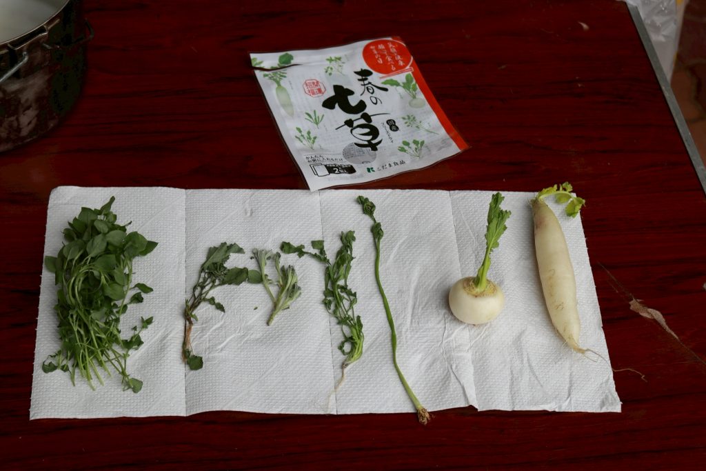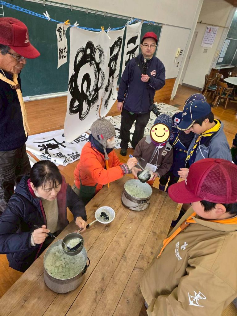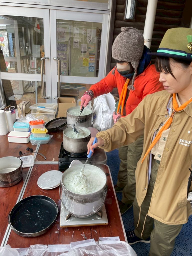 その間、保護者とリーダーたちで七草がゆが用意され、昼食時はあつあつの七草がゆで冷えた体を温めました!!