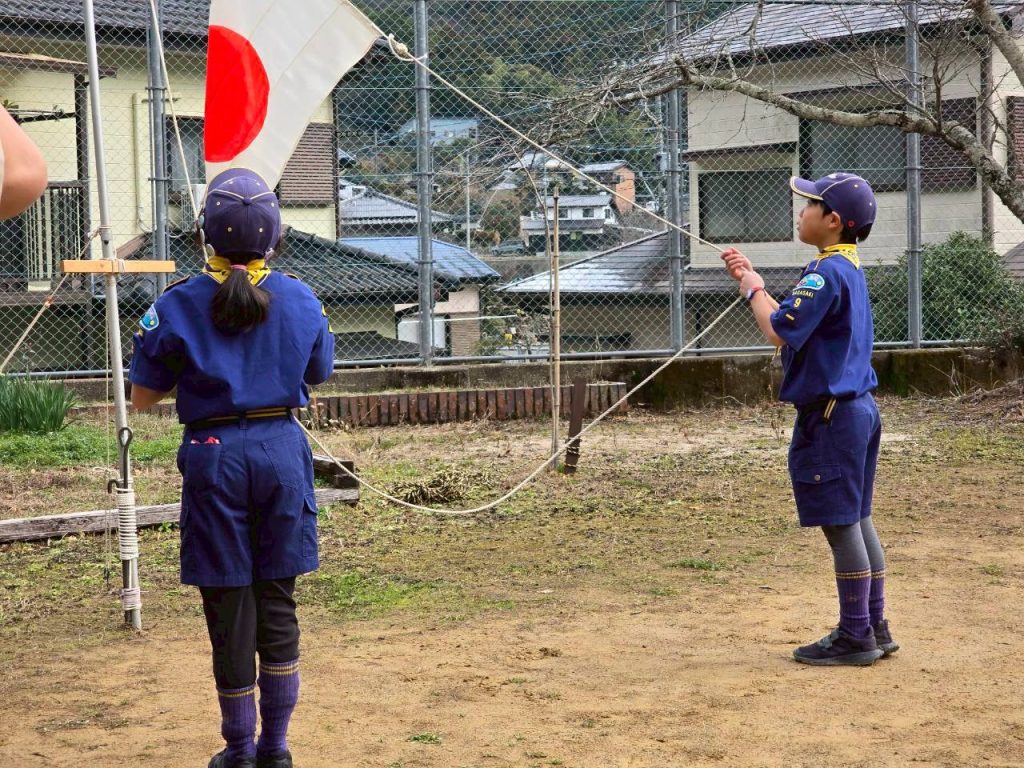 国旗掲揚は、月の輪訓練期間中の10名の中から2名が選ばれ、教わった通りに堂々と国旗を掲揚しました。